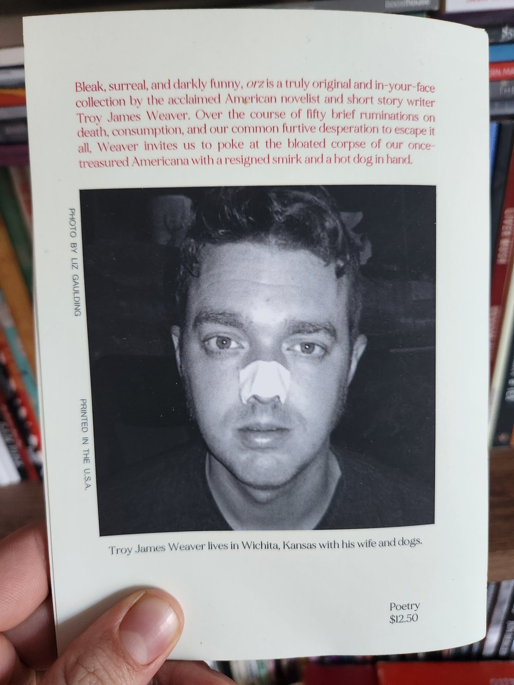 50 small novels by Troy James Weaver about suicide, hot dogs, child abuse, Walmart, subtweets, etc. Perfect bound, 51 pages, paperback, matte cover. Limited edition of 55 copies, variably priced for your pleasure. Each order comes with an exclusive 1.5"x3" excerpt sticker plus other free things.